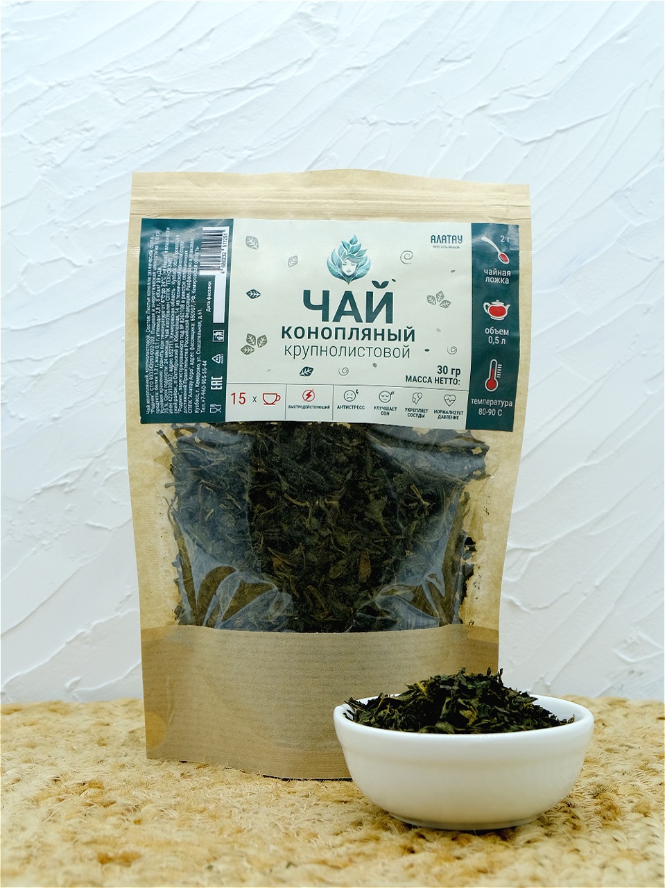 Конопляный чай «Алатау» - это ферментированная высушенная масса крупноизмельченного листа растения Cannabis sativa, сорта «Родник». Этот сорт конопли включен в Госреестр РФ и содержит менее 0,1 % ТГК. Цвет сухой массы – темно-зеленый. Аромат яркий, специфический, травяной.