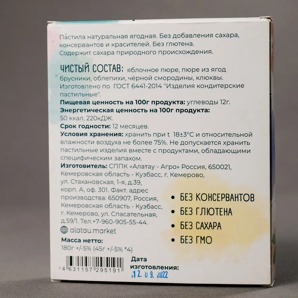 Пастила «Брусничная», «Черносмородиновая» «Облепиховая» и «Клюквенная» от «Алатау» состоит из яблочного и ягодного пюре.