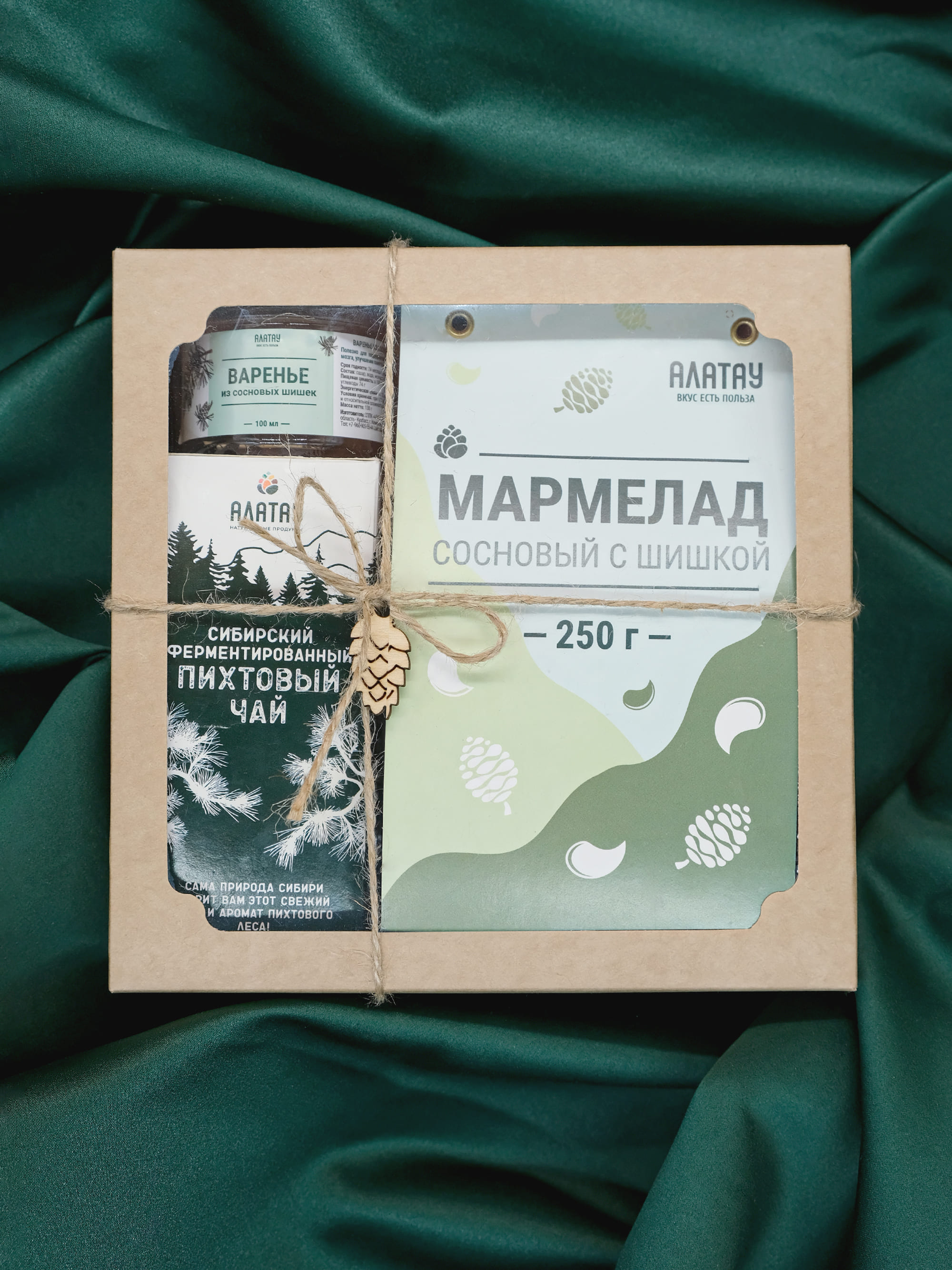 Варенье из сосновых шишек 100 мл - 1 шт; Пастила годная 45гр - 4 шт; Мармелад с сосновой шишкой, 250 гр - 1 шт; Чай пихтовый классический, 50 гр - 1 шт