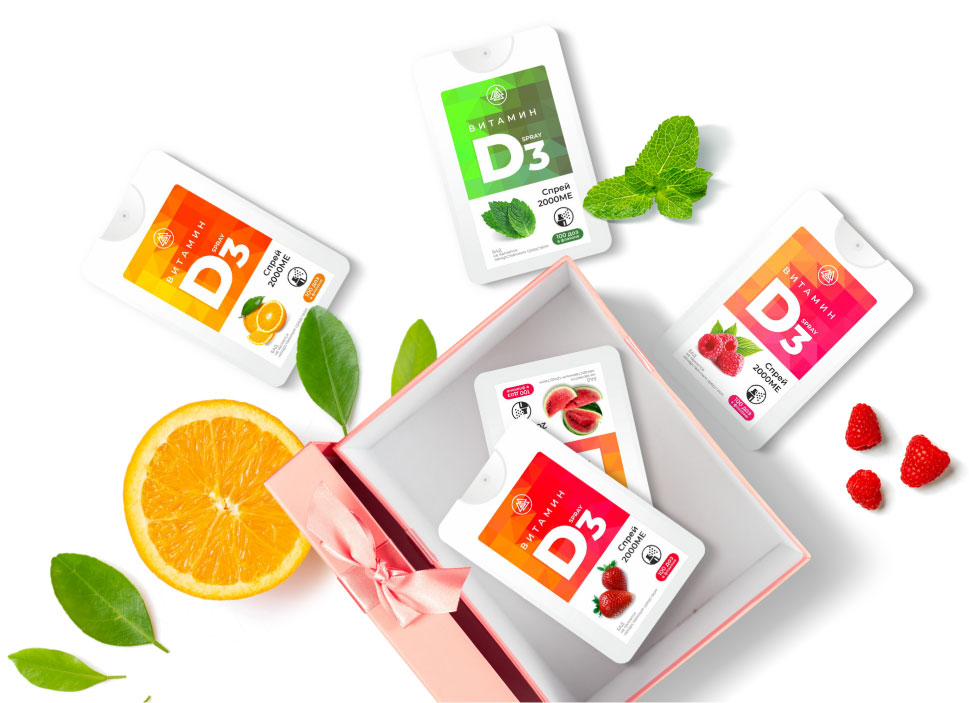 Пищевая добавка витамин Д3 нового поколения в форме спрея. Одно нажатие содержит 2000ме.
